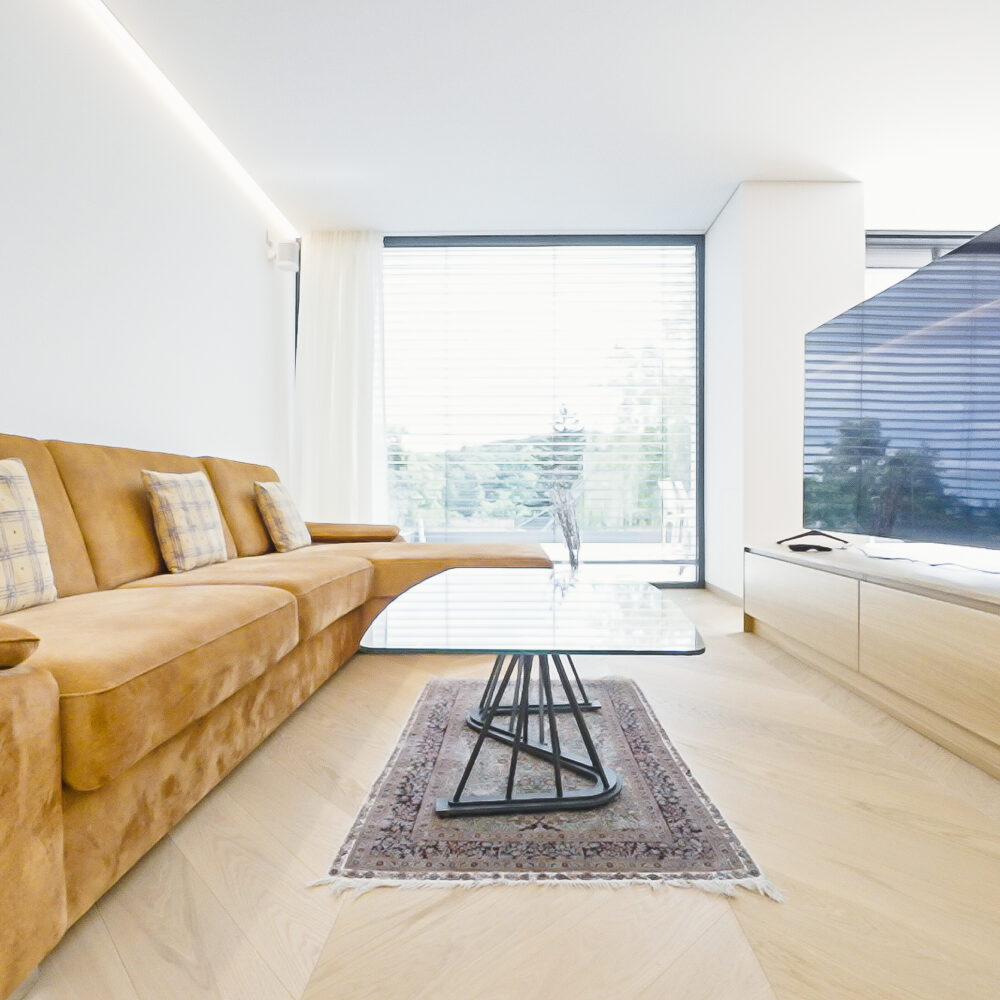 Das Penthouse, welches im Juni 2023 fertiggestellt wurde, besticht durch handverlesene hochwertige Materialien, wie zum Beispiel Fischgrätparkett, ein Loxone-Steuerungssystem in der gesamten Einheit, elektrisch außenintegrierte Raffstores, sowie großformatige Tavertienplatten.